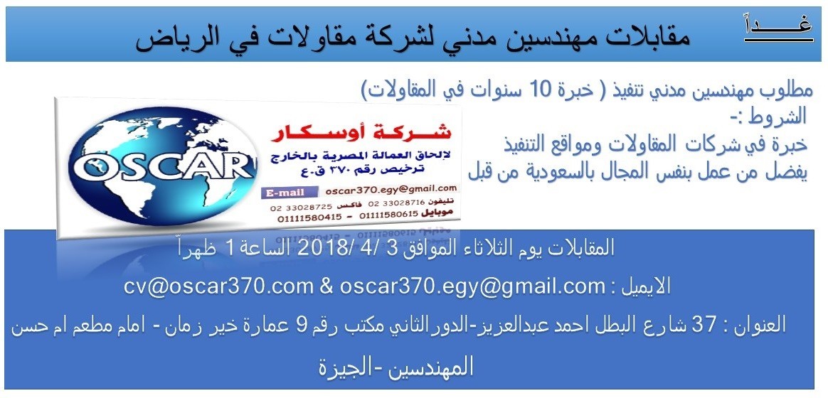 مطلوب مهندس مدني لشركه مقاولات بالرياض السعوديه القاهرة 688255