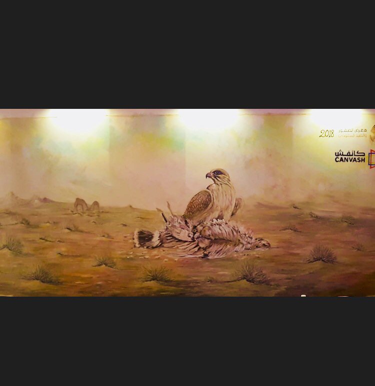 الفنان التشكيلي صالح المحيني على تويتر جدارية مقاس ٦م ٢م نفذتها في معرض الصقور والصيد السعودي الاول في العاصمة الرياض