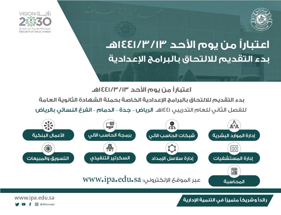 معهد الإدارة العامة On Twitter يعلن المعهد اليوم الدفعة الثالثة من المقبولين والمقبولات في برامجه الإعدادية للفصل الثاني وعلى من لم يتم قبوله الدخول لموقع المعهد الإلكتروني وتأكيد رغبته مجددا Https T Co Eq69wqaqr6