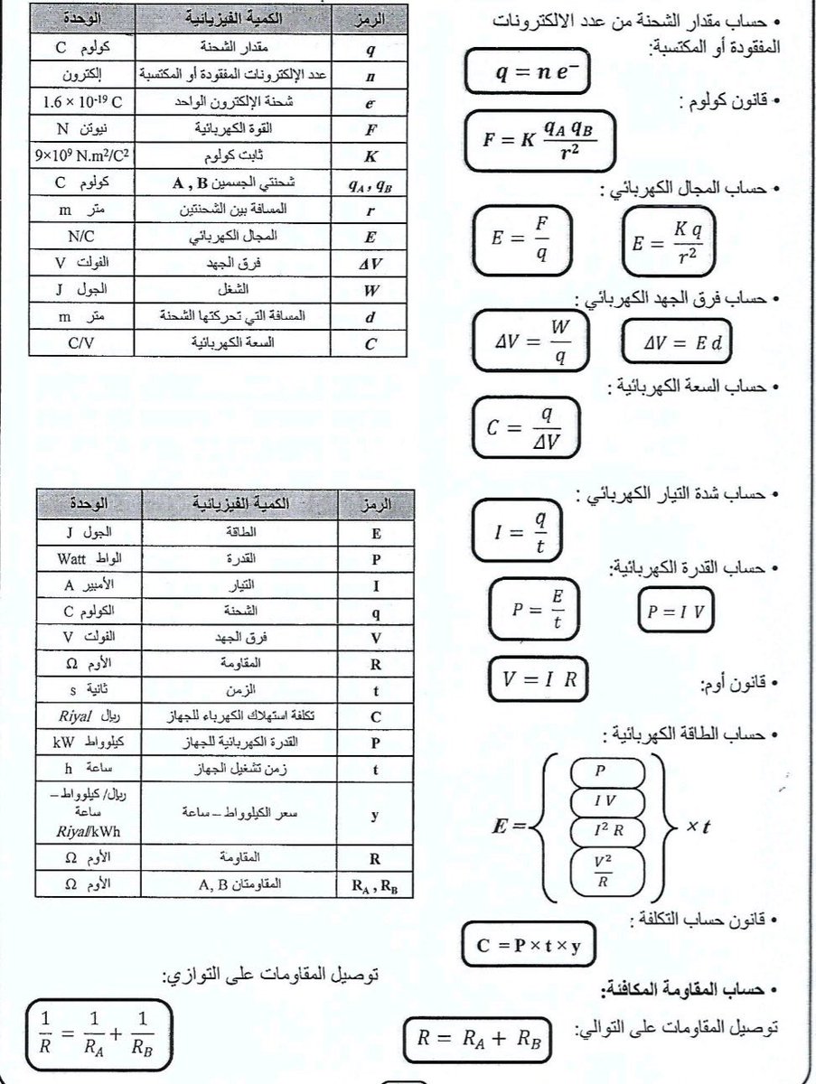 في ورقتان فقط ملخص قوانين ومعادلات الفيزياء للصف الثاني ثانوي