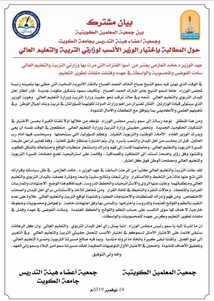 ج أعضاء هيئة التدريس On Twitter بين جمعية المعلمين الكويتية وجمعية أعضاء هيئة التدريس بجامعة الكويت حول إختيار الوزير القادم لوزارتي التربية والتعليم العالي Https T Co 6jftfalf1z