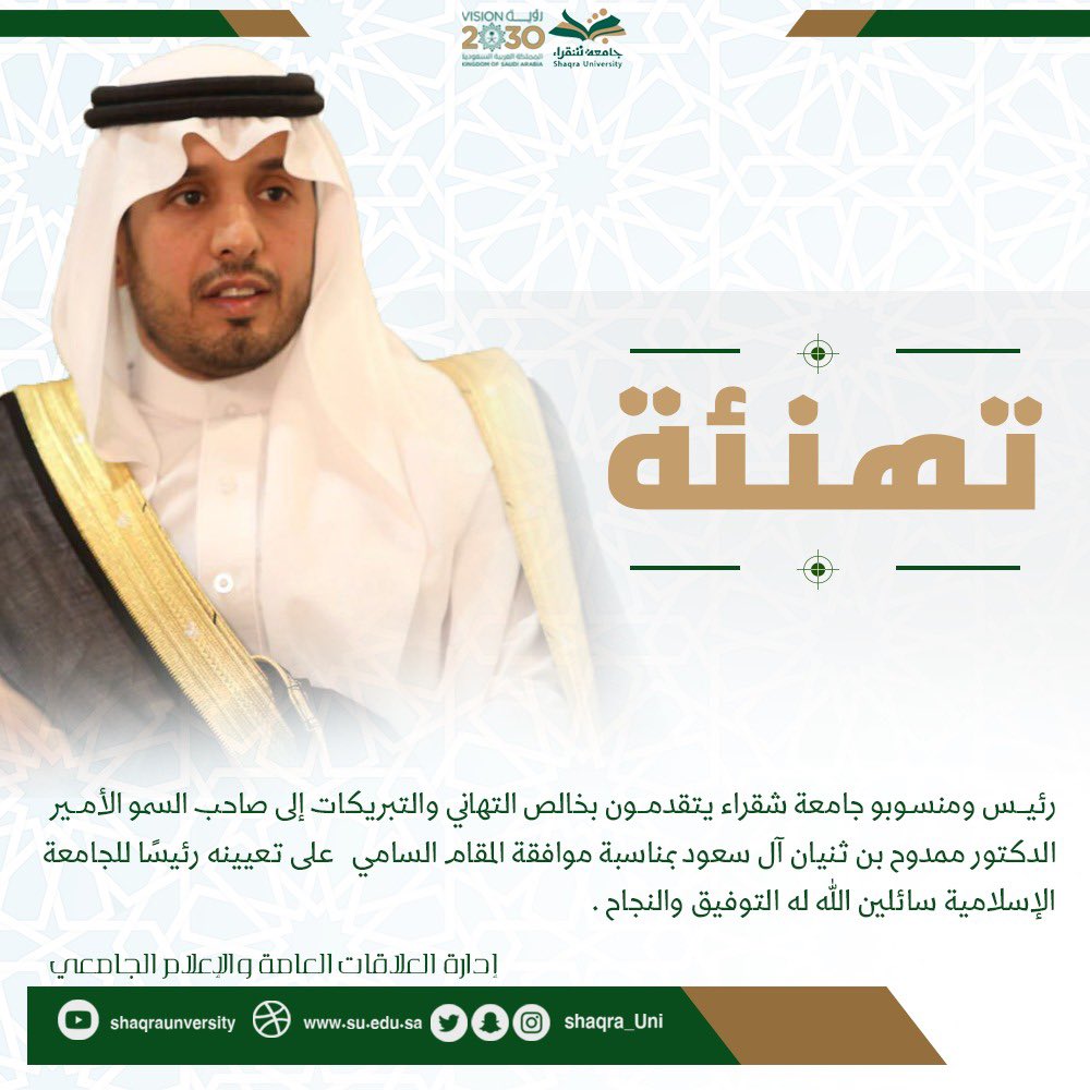 جـامعة شقراء On Twitter رئيس ومنسوبو جامعة شقراء Su يتقدمون بالتهنئة للأمير الدكتور ممدوح بن سعود بن ثنيان آل سعود بمناسبة تعيينه رئيس ا للجامعة الإسلامية Iu Edu Https T Co Rzfujfb3q0