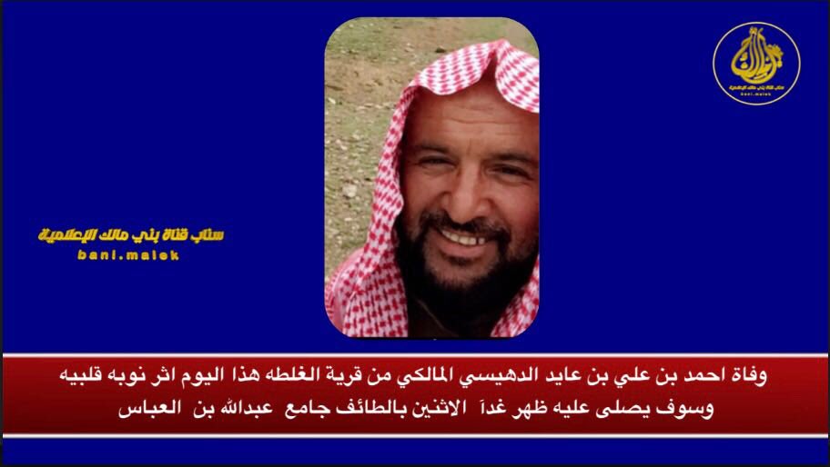 وفاة احمد بن علي بن عايد المالكي من قرية الغلطه بني مالك بجيلة