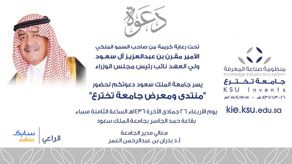 جامعة الملك سعود On Twitter تحت رعاية صاحب السمو الملكي الأمير مقرن بن عبدالعزيز آل سعود يسر جامعة الملك سعود دعوتكم لحضور منتدى ومعرض تخترع Http T Co Nsnpkmjtdq
