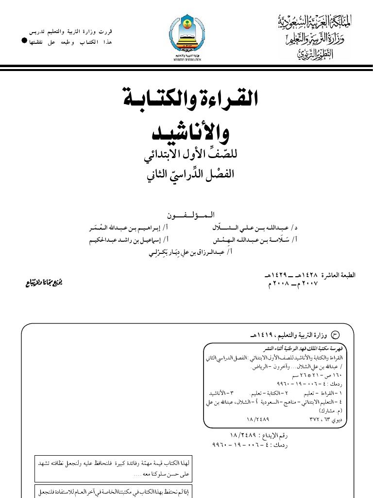 الصف الأول الابتدائي الفصل الدراسي الثاني القراءة و الكتابة و الأناشيد