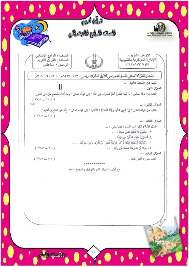 امتحان القران الكريم للصف الرابع الابتدائي الازهرى الترم الاول 2019 بالشرقية الامتحان التعليمى