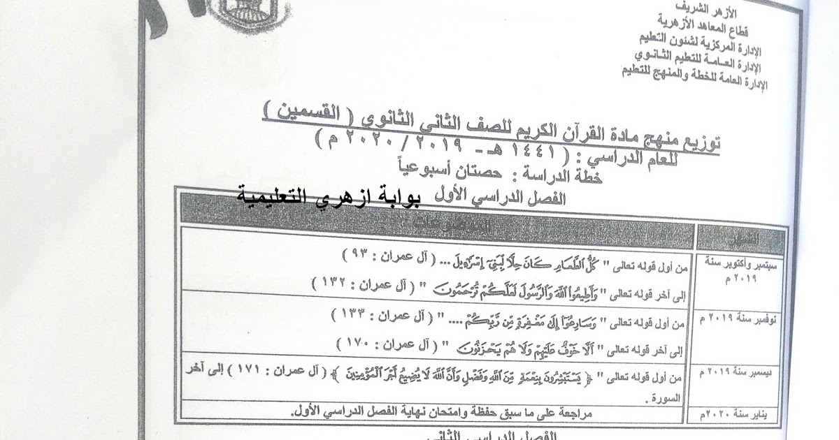 توزيع منهج الصف الأول الثانوي الأزهري الترم الثاني 2020 قطاع المعاهد الأزهرية صباح مصر