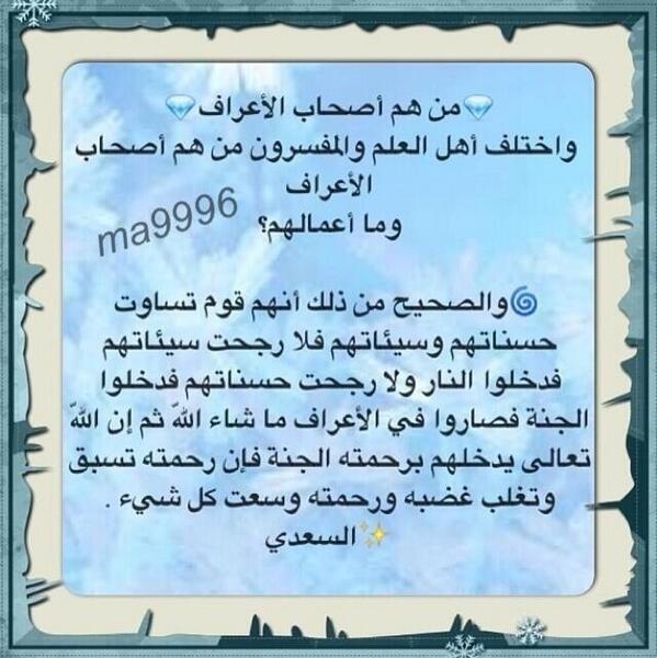 هو سور عال بين الجن ة والن ار يقف عنده أهل الأعراف وقد اختلفت عبارات المفس رين في شرح معنى أهل الأعراف الوارد في القرآن الكريم فذكر بعضهم أن أهل الأعراف هم من استوت حسناتهم وسي ئاتهم وقد قال بهذا القول. 17 هم أولاد المشركين الذين ماتوا قبل سن التكليف. أصحاب الأعراف فيهم خلاف كثير بين أهل العلم فمنهم من قال هم قوم استوت حسناتهم وسيئاتهم وقد نص المفسرون على أن المراد بذلك الصغائر لا الكبائر كما في تفسير القرطبي وغيره من كلام المفسرين وجاءت بذلك ورايات إلا أنها هذه. يرى شرحبيل بن سعد أن أصحاب الأعراف هم الذين استشهدوا في سبيل الله والذين خرجوا.