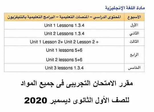مقرر الامتحان التجريبى فى جميع المواد للصف الأول الثانوى ديسمبر 2020